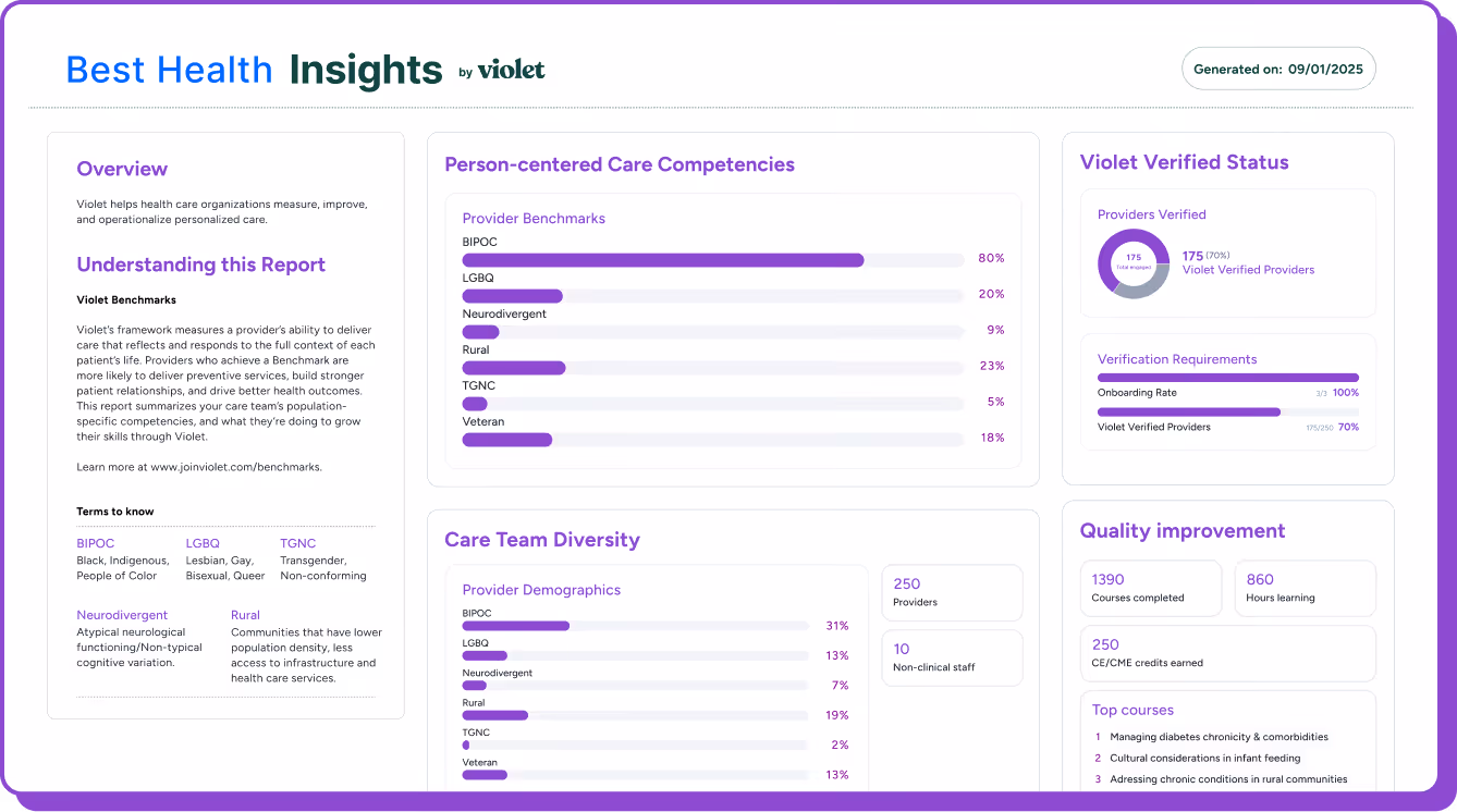 Violet’s CE/CME-accredited training empowers providers to deliver more personalized care for diverse populations.It’s a scalable way to improve quality, close skill gaps, and offer a benefit your clinicians actually value.