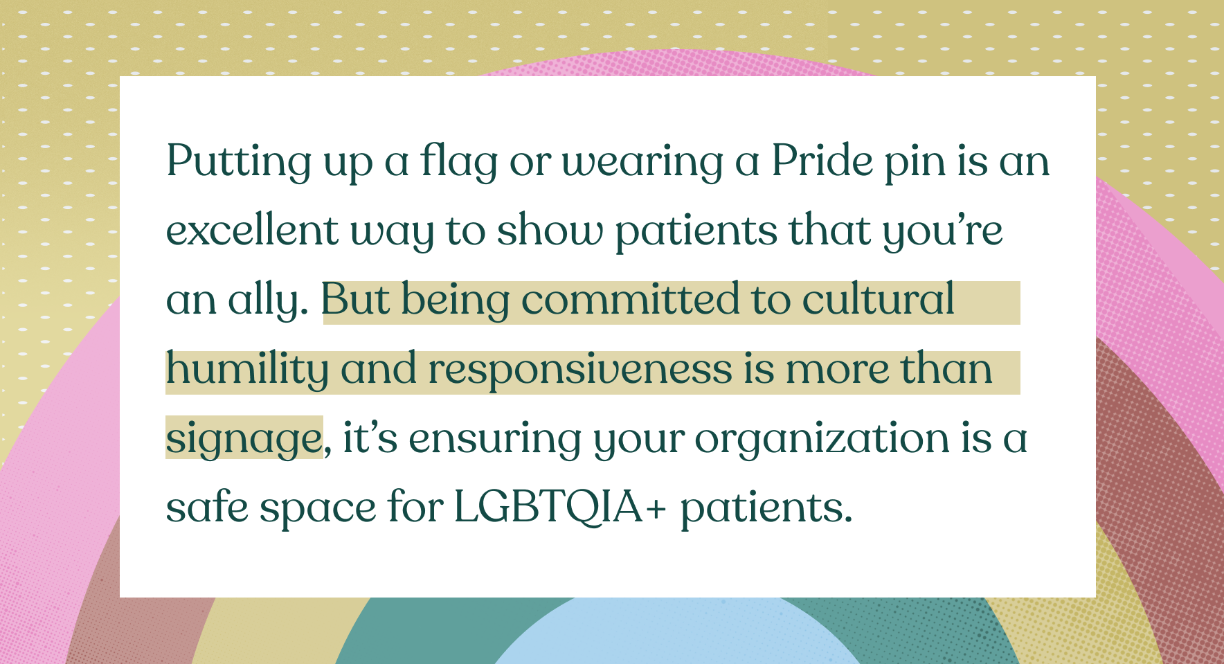 Putting up a flag or wearing a Pride pin is an excellent way to show patients that you’re an ally. But being committed to cultural humility and responsiveness is more than signage, it’s ensuring your organization is a safe space for LGBTQIA+ patients.