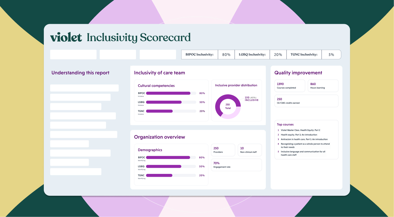 With Violet’s new Inclusivity Scorecard, organizations can effortlessly grow their business while attracting values-aligned employers and payors. Show your commitment to health equity by highlighting the collective cultural competencies of your care delivery team.